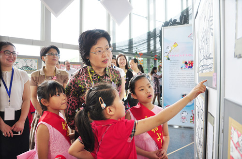 华博雅一行首先来到新区科技交流中心,在小朋友的带领下参观正在举办的无锡市第四届庆“六一”“童心•童画”幼儿美术作品展。画展共展出幼儿原创作品2000多件,作品主要来自无锡地区30所幼儿园,及外地11所美术特色学校,展示了我市实施幼儿素质教育的可喜成果。在展览现场,无论是江溪幼儿园的扎染画、东方娃实验幼儿园的自制儿童绘本,还是铃兰实验幼儿园的剪纸作品、旺庄中心幼儿园的自制龙舟,都让参观者感受到浓浓的艺术氛围。在这里,华博雅一行还亲自动手体验了美术创作的乐趣。