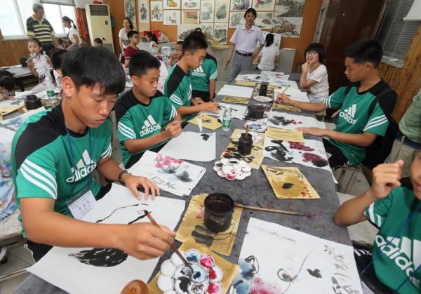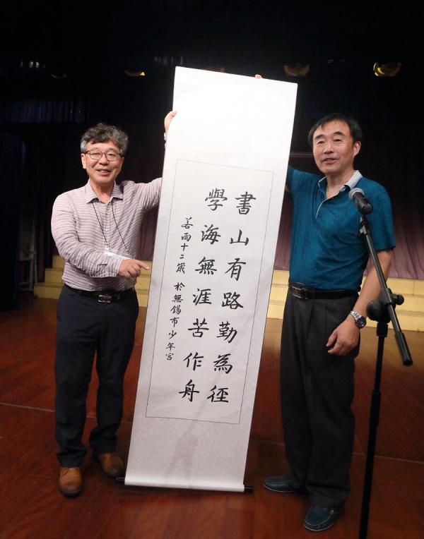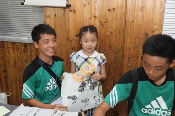 双方首先举行了联欢活动,无锡市少年宫的学员和韩国蔚山广域市南昌中学相互展示了精心准备的精彩节目,大家虽然语言不通,但气氛融洽,处处洋溢着和谐美好的气氛。简短联欢后,交流团成员走进教室开展了传统文化体验活动,无锡市少年宫的学员们一面向来访的韩国学生们展示书法和中国画艺术,一面教授他们如何用毛笔书写,并向韩国同学赠送了自己的作品。韩国的学生们非常喜欢中国的书法、绘画,在老师及学员们的鼓励下拿起毛笔跃跃欲试。