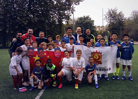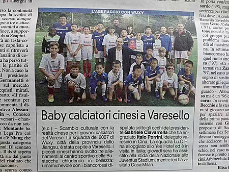 10月3—9日,意大利瓦雷泽省省会瓦雷泽市举办了一场足球文化交流活动。作为两市友谊的“小使者”,10名无锡小球员被邀请前往。10名球员中,有4位小将来自同一所小学——无锡市安镇实验小学,他们是:林王涵宇、孟涵、王科涵、郑树宁。 一周里,无锡的小球员与当地俱乐部的小伙伴们一起学习、一起训练,并于10月7日举行了一场友谊赛。其中安镇实小有3名队员作为主力出征。赛场上,大家密切配合、奋力拼搏。郑树宁同学更是表现突出,连进两球,赢得了观众们的热烈掌声。比赛结束,瓦雷泽市政委员、足球俱乐部主席特意来到球场看望远道而来的无锡小球员,并表示一定带队参加11月无锡举行的“国际友城大会”。 在瓦雷泽市政府和俱乐部的安排下,无锡的小球员们还赴尤文图斯国家球场观看了“世界杯”意大利与西班牙的欧预赛,并前往米兰城参观了AC米兰俱乐部、圣西罗大球场等。 异国他乡,无锡的小球员们文明礼貌、虚心好学,在了解和感受意大利先进足球理念的同时,也结识了许多新朋友,展示了中国少年儿童健康、快乐、向上的的精神风貌。