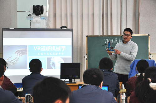 在现场展示环节,南长实验中学的信息技术黄秦祺老师、物理黄薇老师、数学丁亮老师、美术黄镇天老师共同呈上了STEAM课程。这节课,以当前最为热门的虚拟现实技术为核心,尝试引导学生应用信息技术编程、物理学科中的重心、数学的反三角函数和美术中的工业美化设计等多学科资源的融合,来完成“VR遥感机械手”的作品制作。不同课程知识的完美衔接和融合,让与会的老师们耳目一新的同时,也获得了很多教学灵感。