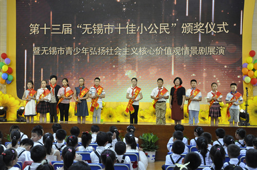 上午,市委常委、组织部长周英,市人大副主任滕兰英,市委副秘书长陈寿彬,市委教育工委书记、市教育局局长唐加俊,市妇联主席夏晓春,团市委书记周子川一行首先来到江苏省无锡师范附属小学本部,参加第十三届“无锡市十佳小公民”颁奖仪式暨无锡市青少年弘扬社会主义核心价值观情景剧展演,及锡师附小一年级入队仪式。周英一行观看了第十三届“无锡市十佳小公民”的事迹短片,并为他们颁奖。自2004年以来,市教育局、市文明办、团市委、市妇联联合开展了“无锡市十佳小公民”评选活动,评选活动每年举行一次,至今已有十三届,共评选产生了130位“十佳小公民”。此项评选活动已成为我市少年儿童培育和践行社会主义核心价值观主题教育活动的品牌项目,也是我市庆祝“六一”儿一童节的传统项目。今年,颁奖现场还进行了我市青少年弘扬社会主义核心价值观情景剧大赛优秀剧目展演,充分展示我市少年儿童培育和践行社会主义核心价值观活动成效。