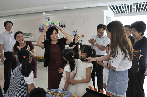 “祝你们‘六一’儿童节快乐!”周英一行刚走进无锡市侨谊幼儿园,就被快乐的孩子们包围了。周英牵着孩子们的手,观看了该园的原创舞台剧《幸福的童年》,参与了幼儿园的杜鹃花节主题活动。周英为孩子们的奇思妙想所吸引,她希望孩子们能够勤动手,培养爱劳动、爱创造的好习惯。周英一行还实地参观了园内的儿童书吧、陶艺室、美术创意室等10个儿童特色工作室,并鼓励小朋友们要培养从小爱看书、爱动脑的好习惯,从书中汲取知识与营养。侨谊幼儿园幼儿园成立于1980年,是一所育人环境优越、教师队伍精良、文化内涵丰厚的公办性质幼儿园,是江苏省首批示范性实验幼儿园。2012年幼儿园整体搬迁至九龙仓时代上城,新建了融现代气息与儿童情趣的新园舍。幼儿园以促进儿童人格发展为核心,坚持人格立园、文化强园、和谐兴园,致力于教育品质、品位、品牌的提升。