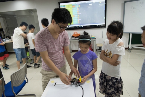 7月2日的活动是“机器人巡线竞技”。无锡市教育信息化管理服务中心邀请了在全国创客界久负盛名的无锡市一中的张禄老师做讲课。张老师通俗易懂的讲解,幽默风趣的语言,引领孩子们进入简答编程的世界。在接下来的两个多小时中,孩子们两人一组,利用电脑软件对手中的小车模块进行编程及调试。从前进到后退、左转到右转,再到感应线条执行相应行驶方向,孩子们在教师的指导下一步步实现预设的效果,耐心打造着属于自己的“巡线小车”。