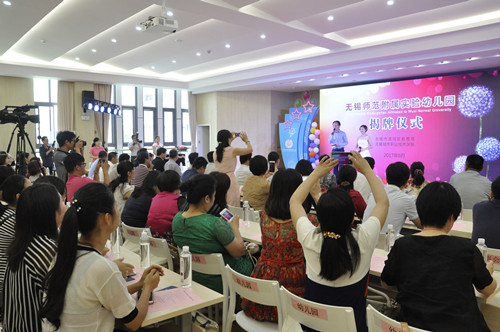9月1日上午,无锡师范附属实验幼儿园揭牌仪式拉开帷幕。这所由无锡城市职业技术学院(无锡高等师范学校)与震泽实验幼儿园合作办学的新学校,在新的一学期迎来了新的机遇与挑战。?? ? 活动现场,滨湖区人民政府副区长吕军、无锡城市职业技术学院党委书记高建宁、市教育局副局长吴洵如等领导共同为无锡师范附属幼儿园揭牌,标志着无锡市震泽实验幼儿园正式更名,同时也掀开了我市学前教育发展的崭新篇章。?? ? 据悉,无锡市震泽实验幼儿园创办于1991年,2005年被评为省示范性实验幼儿园,26年来,震泽实幼在传承和创新的历程中,确立了“让幼儿用自己的力量去生存”的教育理念,逐步形成了“生存教育”的办园特色。2016年,震泽实幼喜迁新址,办园规模进一步扩大。而有着百年办学史的无锡高等师范学校是一所师资力量雄厚、办学形式多元的高等教育学校,建国以来为国家培养了数以万计的专业人才,学前教育系作为学校独立的二级系部,坚持“弘毅”校训,强化科研兴校,已成为无锡地区幼儿园教师的最主要培养及培训基地,为幼儿教育输送了大量人才。?? ? ?本次双方以“高校+幼儿园”的形式合作办园,“鲜明特色、学院风范”的融合办学理念,不仅意味着双方的强强联合,也是学前教育与本地高校合作共建新模式的有力举措。今后,无锡师范附属实验幼儿园的教师们将不间断进入高校课堂,学习先进的教育理论,真正“学有所用”还于学生;无锡高等师范学校学前教育专业的学生,也将分批进入幼儿园进行为期3年的教师实践,在实践期间,学生需要完成相应量的课题研究,而研究成果将反哺幼儿园的发展。锡师附幼与锡师将基于共同的愿景,在保教实践、课程开发、学术研究和教师专业发展等多领域开展深度合作,智慧共享,互利共赢,进一步推进幼儿园专业建设,打造学前教育优质品牌。值得一提的是,今后双方还将共建远程教育系统,将幼儿园的每日课程进行转播,形成教学课件,延伸学生理论知识的“广度”,最终将理论学习与实践体验融为一体,提升专业水准。