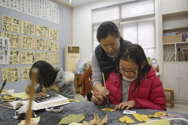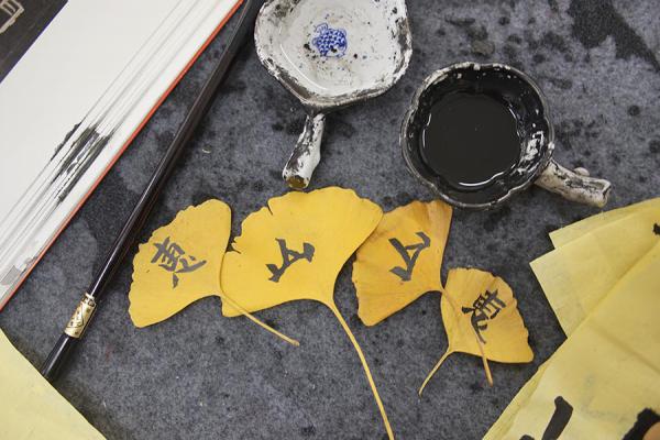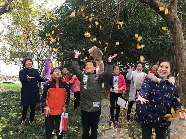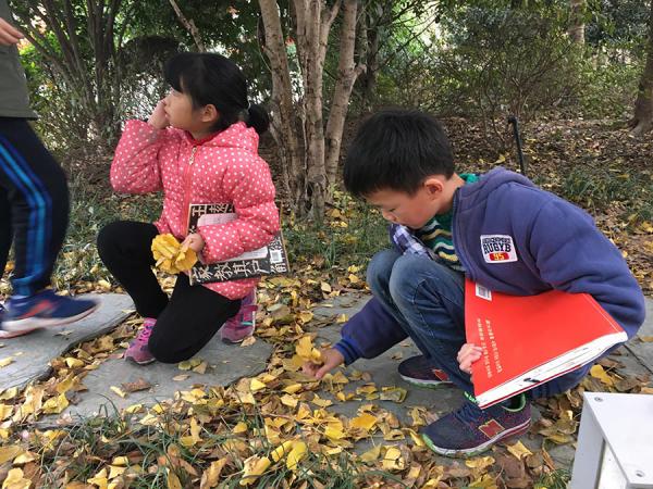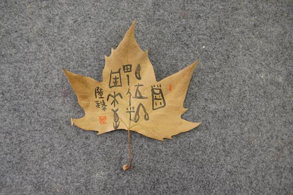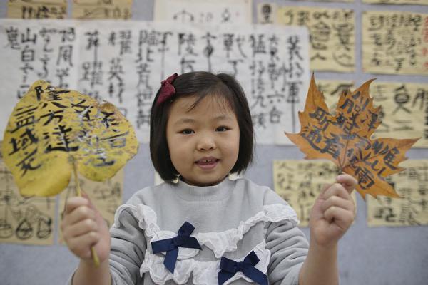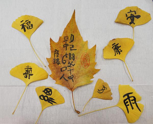 首先,从教室开始寻找秋天,孩子们根据已有的知识说一说关于秋天的特色,唱一唱《秋天在哪里》。然后,周老师带领孩子们去运河公园采风,在草地上踩踩落叶,听着叶子发出的沙沙声;捡拾落叶,捧在手里又散开,秋天的美景和孩子们的笑脸融为一体,就像是一幅美丽的图画。 最后,回归课堂,用毛笔书写美好的祝愿。孩子们各有各的想法,有的用银杏叶写下“福寿安康”送给长辈;有的写了篆书“和”响应习总书记和谐社会的号召;有的书写了甲骨文,在黄绿斑驳的树叶上印一抹朱红寻访古人的气息,留住了秋天,真是太有想法了! 书画同源,儿童书法课程就是将儿童书法与人类早期绘画相结合,以线条去描绘情感,以绘画性去表现书法的张力和情趣,寻找原生态书写趣味,使儿童的心理、生理发展与中国文字书写的演变过程同步发展。希望通过对书法的学习,既让文化特质体现在学生的作品中呈现,更可以在多变的教学形式中感受书法源远流长的隽美和意义。