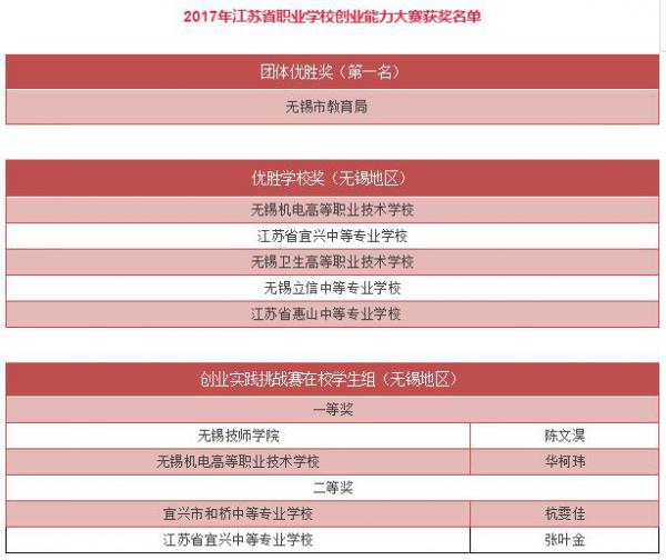 ? 12月13日下午,由省教育厅、省人社厅和共青团江苏省委联合举办的2017年江苏省职业学校创业能力大赛,在经过一个多月的创业知识竞赛、四天的创业训练营,以及两天的创业计划竞赛与创业实践挑战总决赛后在锡正式落下帷幕。无锡勇夺团体优胜奖第一名以及三个一等奖,成绩喜人。省教育厅副厅长曹玉梅,无锡市副市长刘霞,省教育厅职教处处长刘克勇,团省委少年部副部长徐美华,省职业技术教育学会副会长兼秘书长尹伟民,无锡市委教育工委书记、教育局局长唐加俊,市委教育工委副书记、教育局副局长符菊成等出席闭幕式。 来自全省33所学校的93名学生带来参赛的43个创业项目可谓丰富多彩,43位项目负责人结合创业实践,阐述创业梦想,以活跃的创新思维、精湛的技术、娴熟的讲述、创业的信心,赢得了现场评委的高度认可。大赛涌现了一大批具有市场空间和开发潜力的可行性创业项目。 曹玉梅在闭幕式上说,这次大赛,组委会和有关学校精心组织、科学安排,各位裁判员严格按照比赛和评分规则秉公执裁,各位选手遵守比赛规则、尊重对手,赛出了水平和风格,展现了职业学校师生良好的精神面貌。希望在以后的工作中,各地各校要进一步重视创新创业教育,以提升中职生的综合能力素质为目标,建立健全创新创业教育领导和工作机制,完善课程内容,重视培养指导教师团队,努力开展校企合作,积极搭建创业平台,营造浓厚创业氛围,不断提高工作水平,在学生心田种下更多创业的种子。 闭幕式上宣读了2017年江苏省职业学校创业能力大赛决赛成绩,无锡成绩喜人。无锡市教育局获团体优胜奖第一名,江苏省惠山中等专业学校的任韧获创业实践挑战赛毕业学生组一等奖,无锡技师学院的陈文淏、无锡机电高等职业技术学校的华柯伟获在校学生组一等奖(具体名单见文末),展现了无锡职业学校较高的创新创业教育水平。 在曹玉梅和刘霞的共同见证下,活动现场还举行了2017年江苏省职业学校创业能力大赛项目合作签约仪式。 近年来,我市大力实施创新驱动核心战略和产业强市主导战略,积极鼓励职业院校学生创业就业。目前,全市共建成大学科枝园1个,学生创业园24个,省级大学生创业示范基地和创业教育示范学校12个,职业学校毕业生就业率98%以上,创业率稳定在3%以上。?
