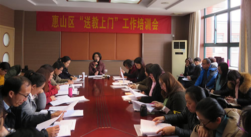 为做好送教上门教师培训工作,12月6日,惠山区特殊教育指导中心又在区特殊教育学校组织了全区送教上门工作指导教师专题培训,特校校长从尊重每个生命的角度阐述了“送教上门”的现实意义,同时鼓励老师们珍视这项工作,在过程中体悟独特的生命个体、丰富教育经历、提升自我的教育境界。指导中心老师还对送教上门的工作量安排、考核方法、注意事项等作了具体说明,并就学生评估量表使用和制定个别化教育计划进行详细、直观的指导。惠山区教育局基教科负责同志在会议总结时指出,惠山区特殊教育通过一个阶段的努力,特别是近一年的快车道发展,取得了一些成绩,但是必须看到此项工作任重而道远,以后努力的方向是完善发展体系,以随班就读为主体,特殊学校为骨干,送教上门为补充,实现全纳、悦纳、慧纳,真正做到一个也不少。