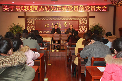 会议由季福根同志主持。第一个议程,首先,袁晓晓同志宣读了转正申请书,汇报预备期中自己在思想,生活,工作等各方面的情况;接着,考察人及其他党员同志相继发言,表明态度。最后大会选举表决,全票通过并同意袁晓晓同志转为正式党员,并将上报上级党委。之后,王永健同志进行总结。王书记热情地欢迎新生力量加入中国共产党,并对袁晓晓同志及全体党员提出两点要求:一是要进一步严格要求自己,为了最初的信仰而一步一个脚印付出自己的努力;二是要进一步发挥先锋模范作用,“写在纸上的诺言要变为切实的行动”!同时,也提醒每一个党员,在各自的岗位上牢记身份,牢记使命,以崭新的面貌迎接新的一年!