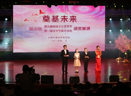 “艺术点亮人生,阅读成就未来”。为全面总结表彰区第九届校园文化艺术节、区第一届读书节活动成果,进一步打造锡山教育品牌,1月4日下午,“奠基未来”锡山区第九届“校园文化艺术节”暨第一届“读书节”展示活动颁奖展演在无锡市锡山实验小学报告厅隆重举行。市教育局副局长许敏,以及锡山区教育局党委书记、局长冯冬雁,区政府教育督导室主任、区教育局副局长孟晓东,区教育局副局长范忠等参加了这一盛会。 “校园文化艺术节”展演共分“逐梦未来:多彩的足迹”、“遇见未来:动感的音符”、“畅想未来:诗意的远方”三个篇章进行。 活动在天一中学一曲铿锵奋进的铜管乐合奏《逐梦.启航》中拉开了帷幕。来自全区各中小学在“文化艺术节”、“读书节”期间展现的经典特色节目纷纷登台亮相:激扬爱国情怀的经典诵读《读中国》《少年中国强》等,或娓娓深情,或慷慨激昂;绽现青春姿态的曼妙舞蹈《桃花红》《荷韵》《天堂草原》等,时而翩跹优柔,时而激越张扬;演绎时代乐章的校园合唱《美好的远方》《贝加尔湖》《共筑中国梦》等唱出了锡山师生的精气神,唱响了新时代的中国梦,校园剧《全家福》真情满满,读书报告《走进苏轼》情思盈盈…… 绚丽的舞台,嘹亮的歌声,优美的舞蹈,动人的音乐,欢声笑语,芳华绽现,现场观众反响热烈,掌声不断,高潮迭起。 本次活动还对区第一届”读书节“展示活动、区第九届”校园文化艺术节“的获奖学校进行了颁奖。 时光荏苒,艺术在这缤纷的锡山校园绽放;岁月更迭,阅读在这多彩的锡山校园芬芳。历时一年的第九届“校园文化艺术节”及第一届“读书节”圆满结束、硕果累累。展演暨颁奖活动的举行,为进一步丰富锡山校园文化生活,展示师生才华,提升艺术素养提供了重要的平台,堪称“校园文化盛宴”,是对锡山艺术教育、“阅读工程”纵深发展的一次有力推动,对提升全区各中小学办学品质、深化区域素质教育意义深远。